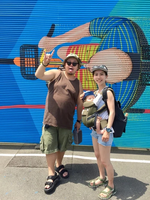 A quick and large “Bike Man” piece for the community in Shonan Kanagawa. We painted a large corrugated wall and to my relief, found some roller pads made especially for this. the whole weekend was lots of community members setting up art stations for the young people to get involved with. Another honor, to be a part of a coming together like this for everyone involved. The figure is of a community friend “Daisaku” who has a big personality in this area, showing support for lots of his friends and people in the area. I met him first in 2013 and each visit to this area got to know him more, so when I was asked to paint I decided I would paint Daisaku pedaling out to the beach to catch some water with his surf stick.