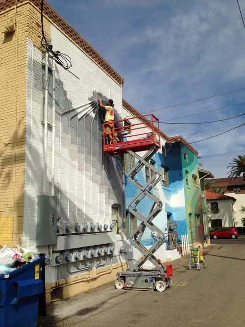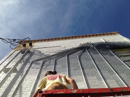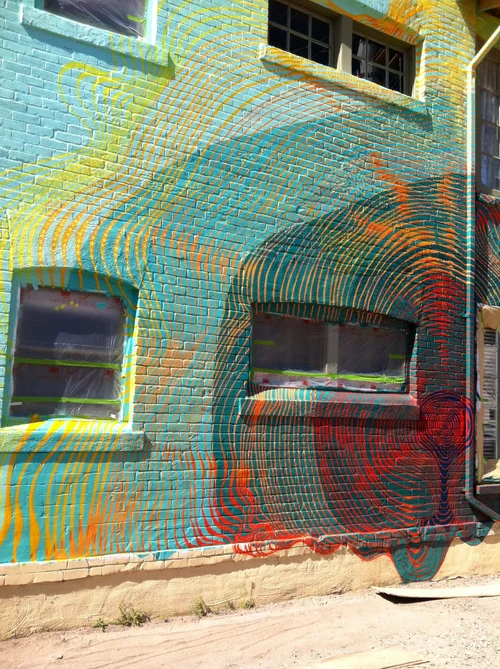 This is on the backside north facing wall of the Churchill, a locally driven gathering of efforts in food drink and retail - they have also led an effort to support local art along the alley next to them. Very proud to be involved with the overall vision here. The joys of riding your bicycle down the street to do your work for folks/efforts you respect.