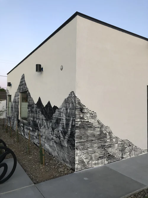 Freestyle from a rough sketch…… I wanted to get into the deserts imagination, work in a black and off-white palette, with nods to newsprint of earlier times. There is about 6 layers of rolled latex primer on the sand stucco surface in each of the 3 separate pieces.